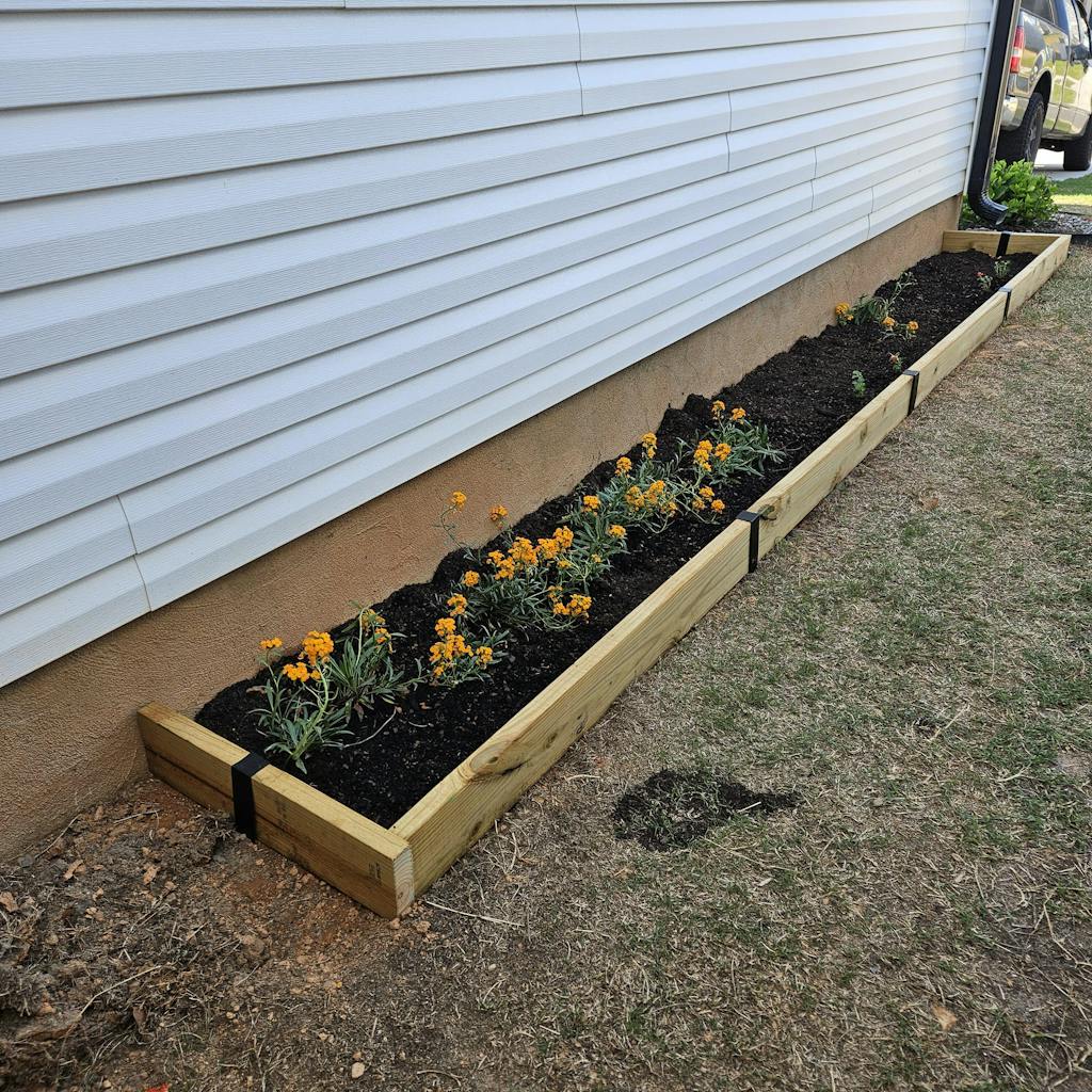 To make a three-sided bed, such as a flower bed on the side of your house, use three boards and six 2xEDGE Staples.